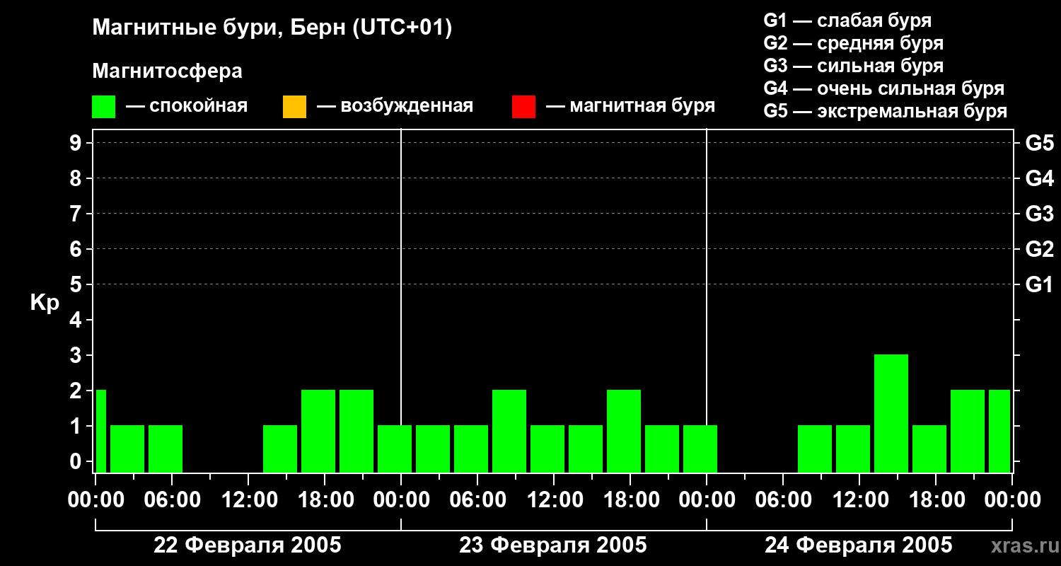 Изменения геомагнитного индекса Kp с 22 по 24 февраля 2005 года для средних широт