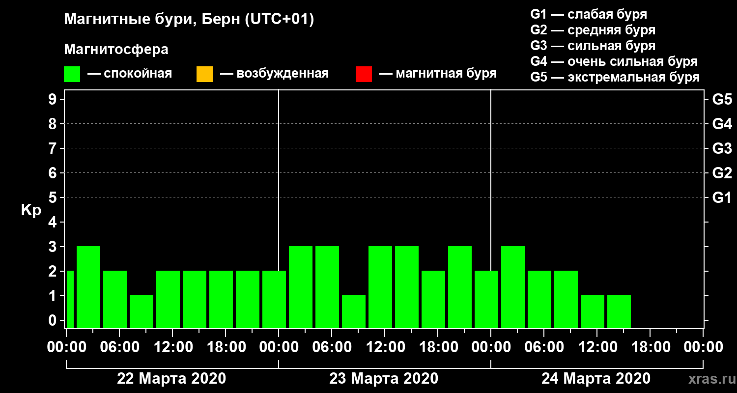 Изменения геомагнитного индекса Kp с 22 по 24 марта 2020 года для средних широт