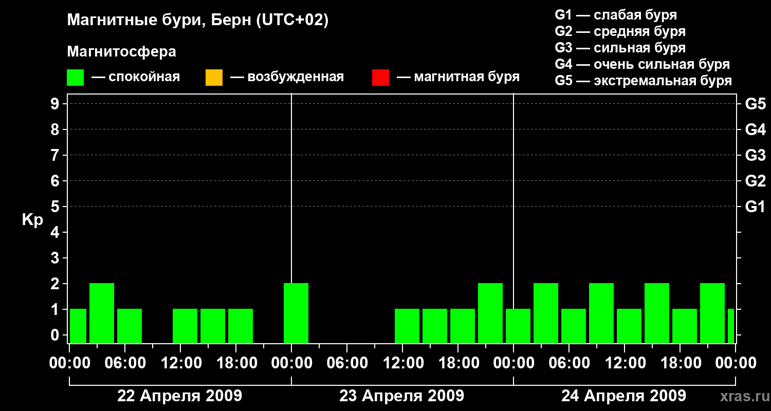 Изменения геомагнитного индекса Kp с 22 по 24 апреля 2009 года для средних широт