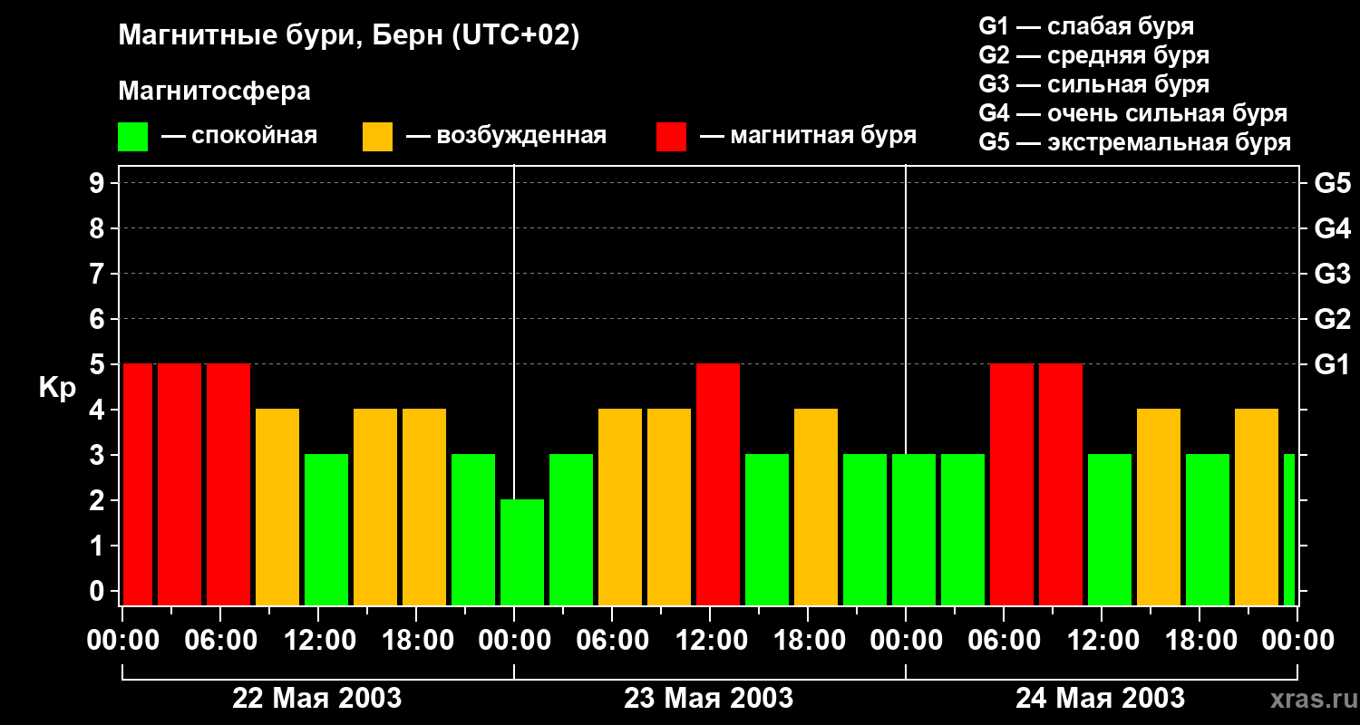 Изменения геомагнитного индекса Kp с 22 по 24 мая 2003 года для средних широт