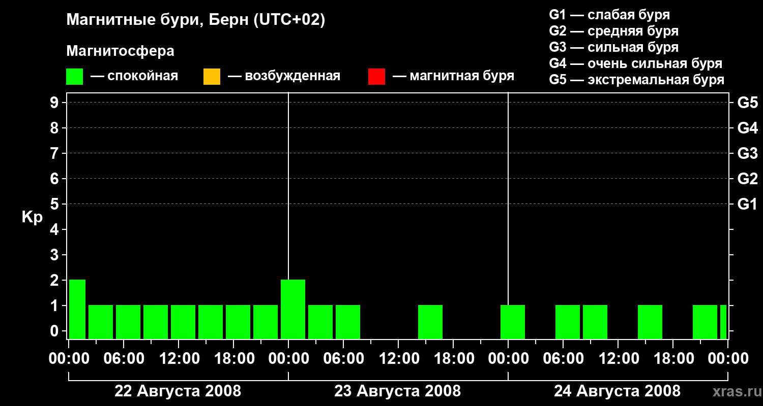Изменения геомагнитного индекса Kp с 22 по 24 августа 2008 года для средних широт