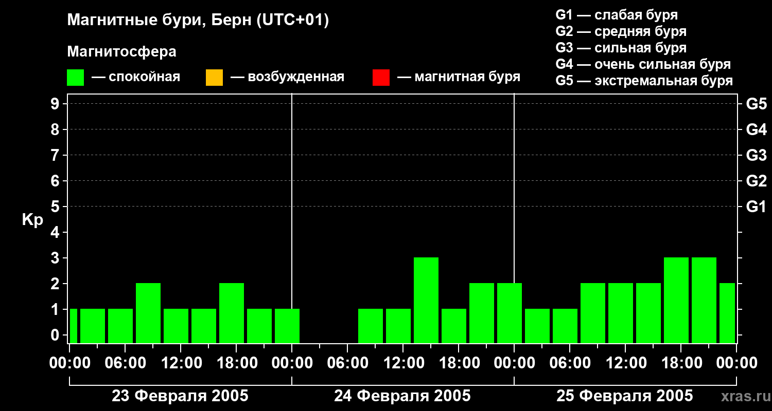 Изменения геомагнитного индекса Kp с 23 по 25 февраля 2005 года для средних широт
