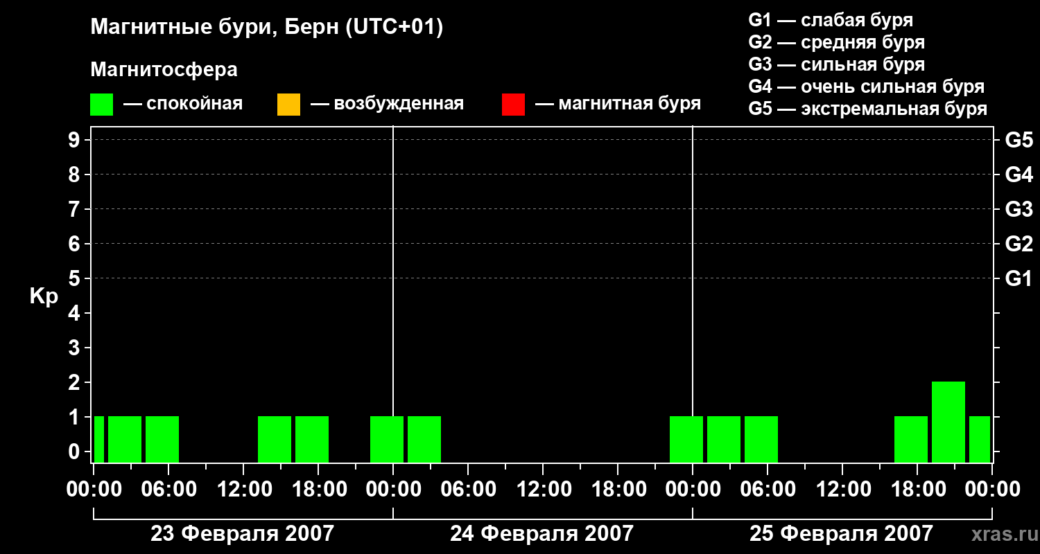 Изменения геомагнитного индекса Kp с 23 по 25 февраля 2007 года для средних широт