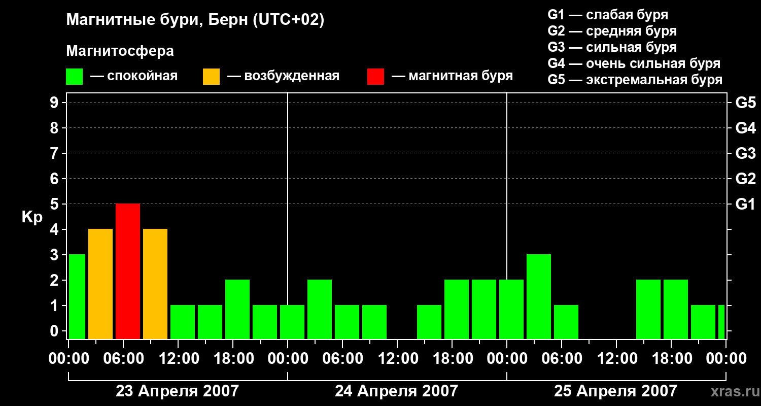 Изменения геомагнитного индекса Kp с 23 по 25 апреля 2007 года для средних широт