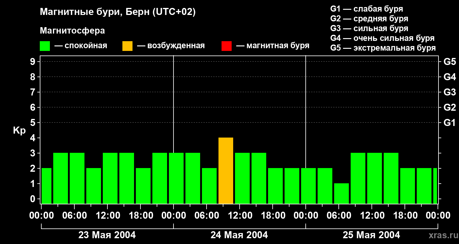 Изменения геомагнитного индекса Kp с 23 по 25 мая 2004 года для средних широт
