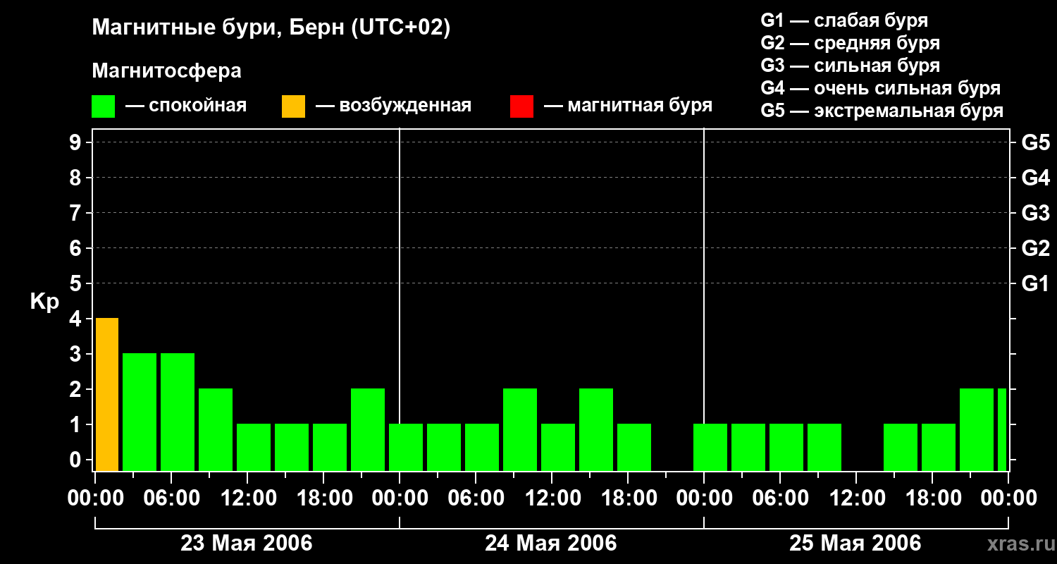 Изменения геомагнитного индекса Kp с 23 по 25 мая 2006 года для средних широт