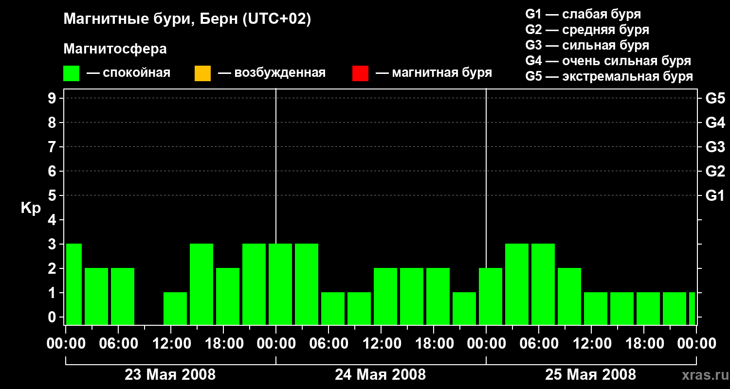 Изменения геомагнитного индекса Kp с 23 по 25 мая 2008 года для средних широт