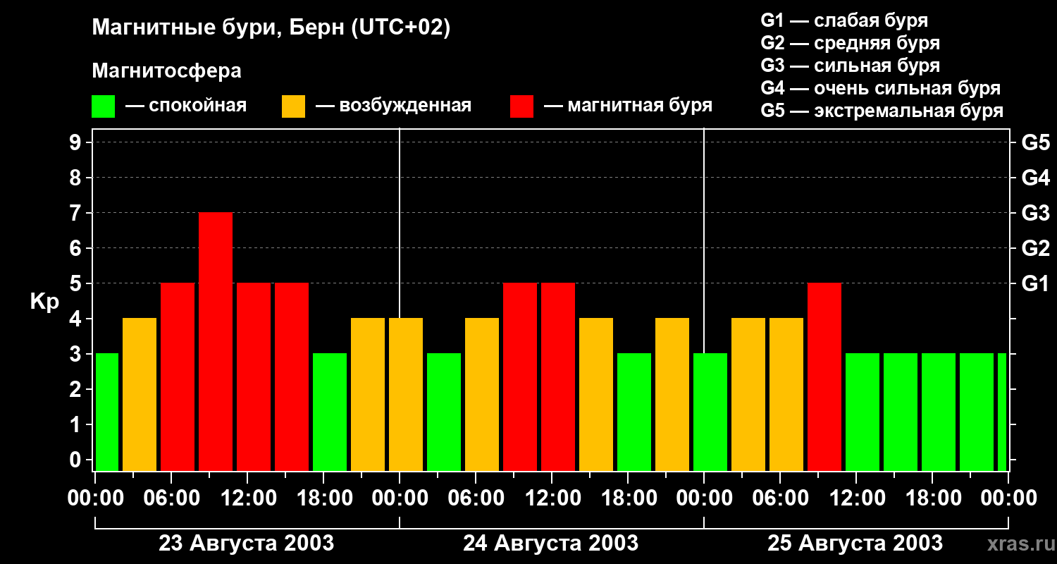 Изменения геомагнитного индекса Kp с 23 по 25 августа 2003 года для средних широт