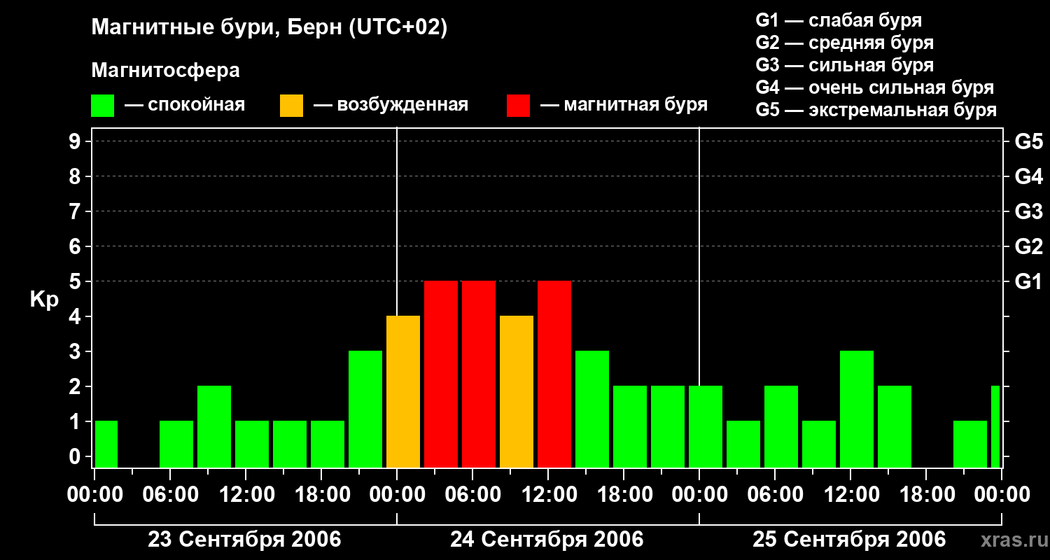 Изменения геомагнитного индекса Kp с 23 по 25 сентября 2006 года для средних широт