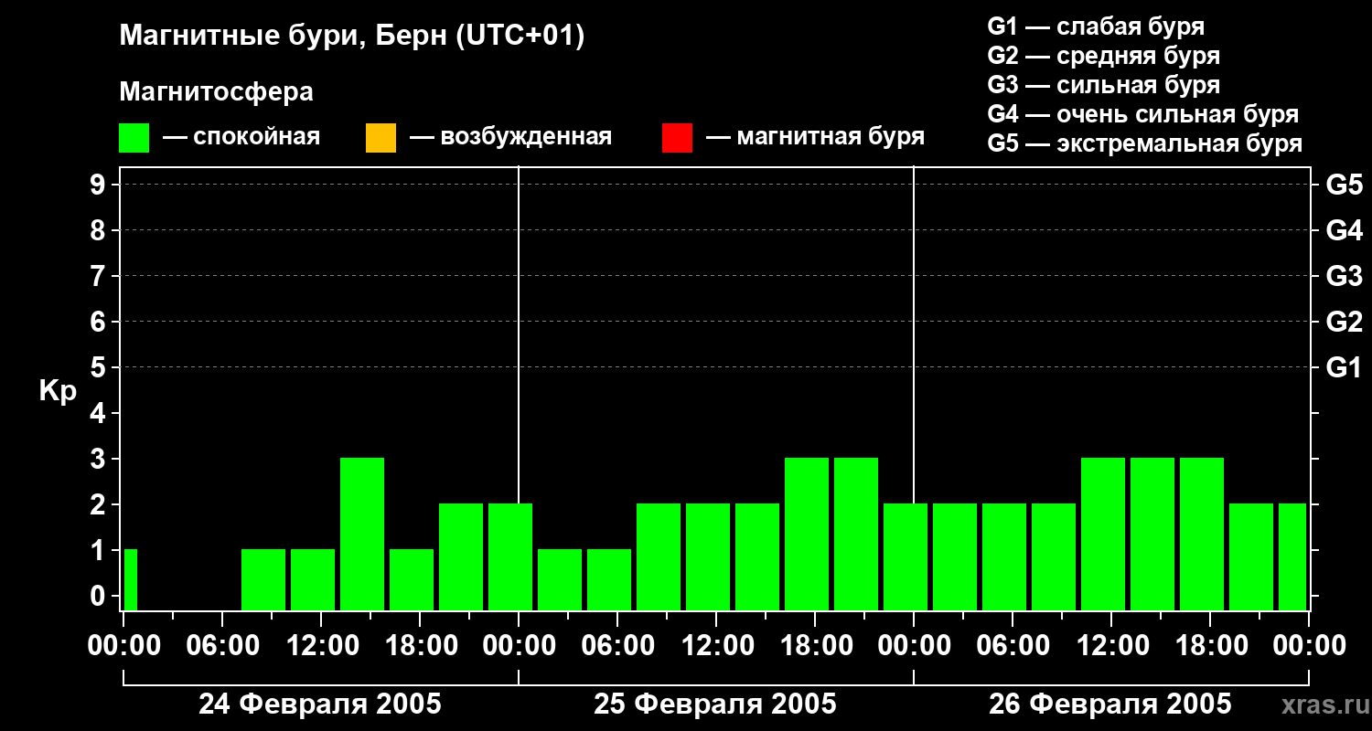 Изменения геомагнитного индекса Kp с 24 по 26 февраля 2005 года для средних широт
