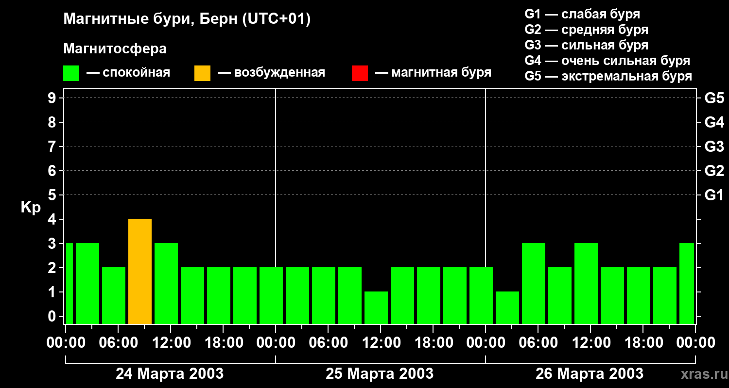 Изменения геомагнитного индекса Kp с 24 по 26 марта 2003 года для средних широт