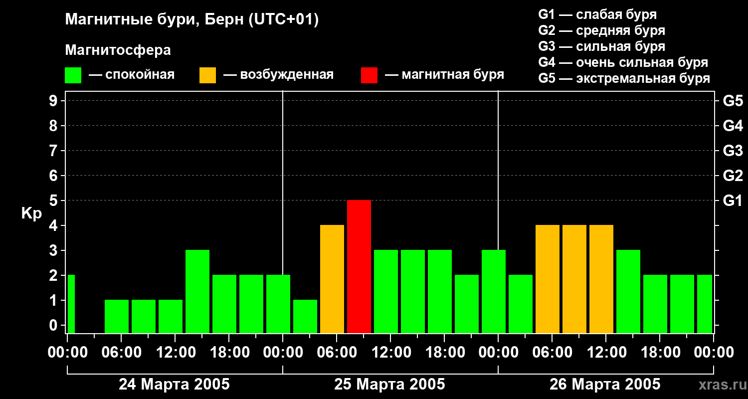 Изменения геомагнитного индекса Kp с 24 по 26 марта 2005 года для средних широт
