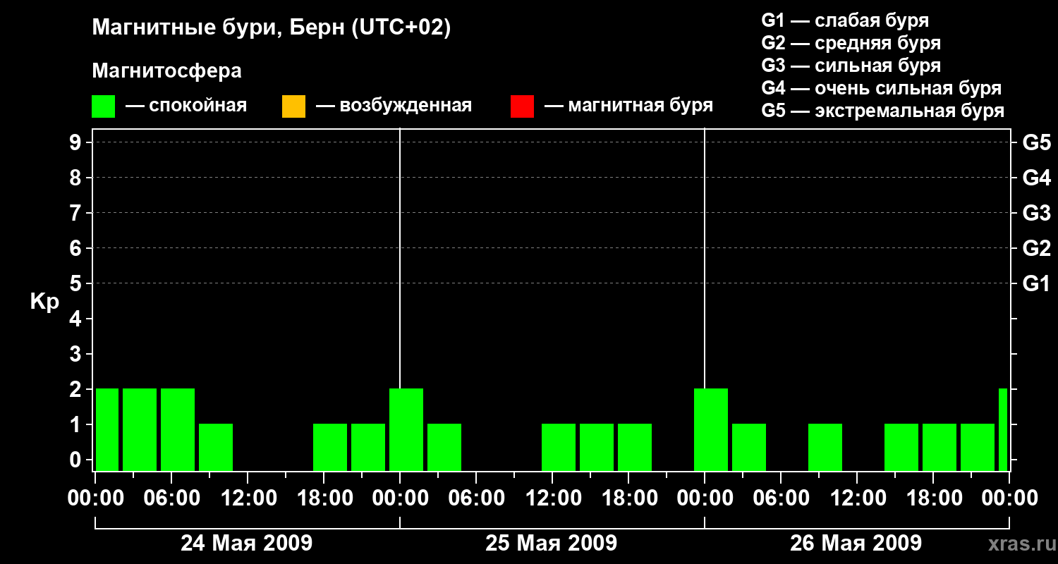 Изменения геомагнитного индекса Kp с 24 по 26 мая 2009 года для средних широт