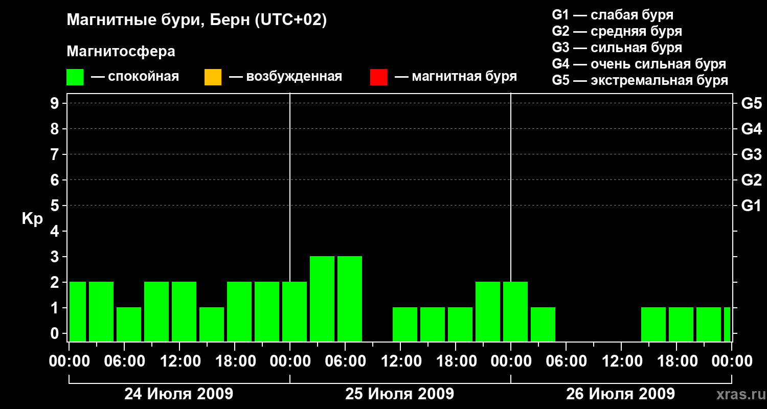 Изменения геомагнитного индекса Kp с 24 по 26 июля 2009 года для средних широт