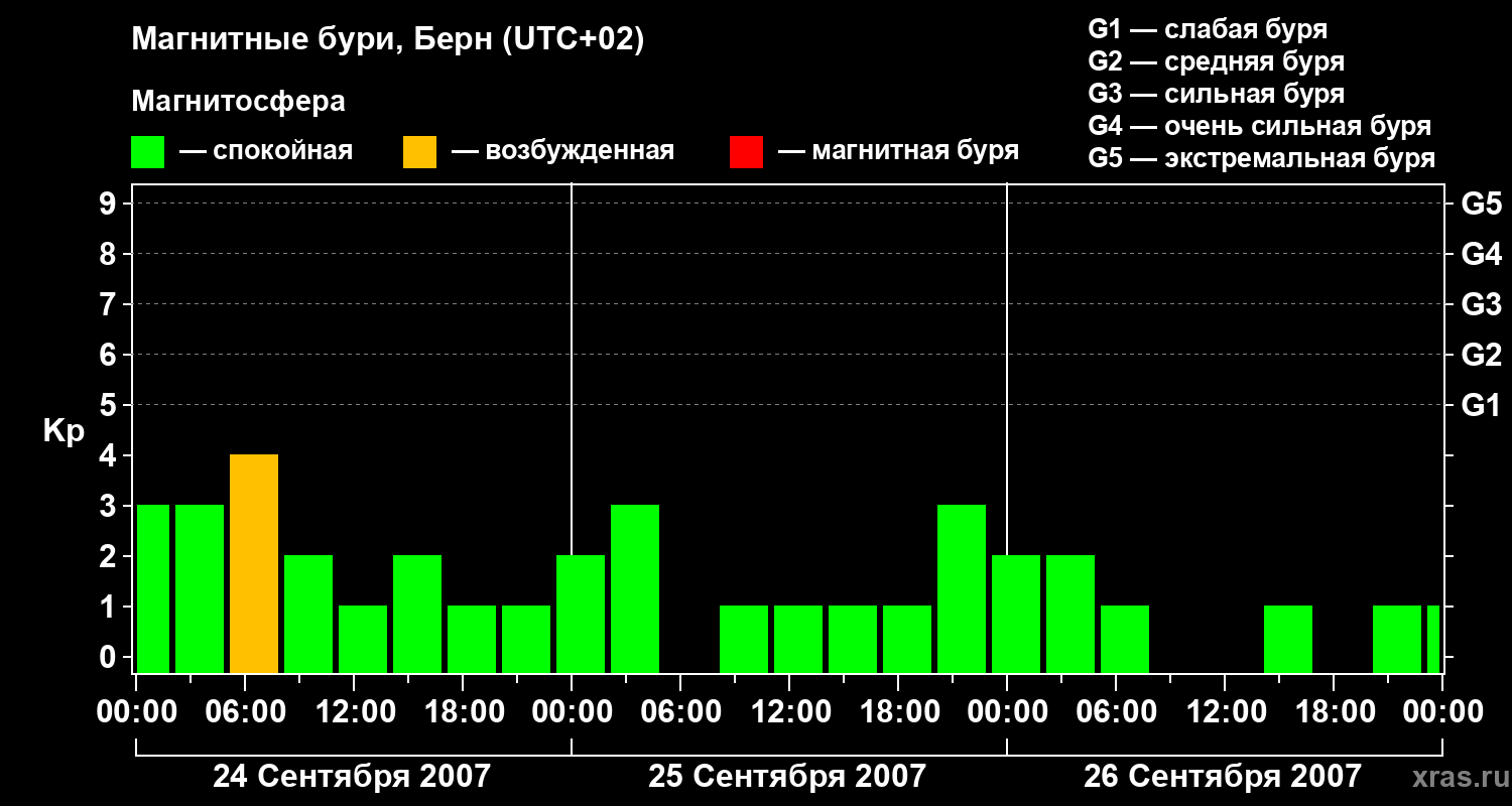Изменения геомагнитного индекса Kp с 24 по 26 сентября 2007 года для средних широт