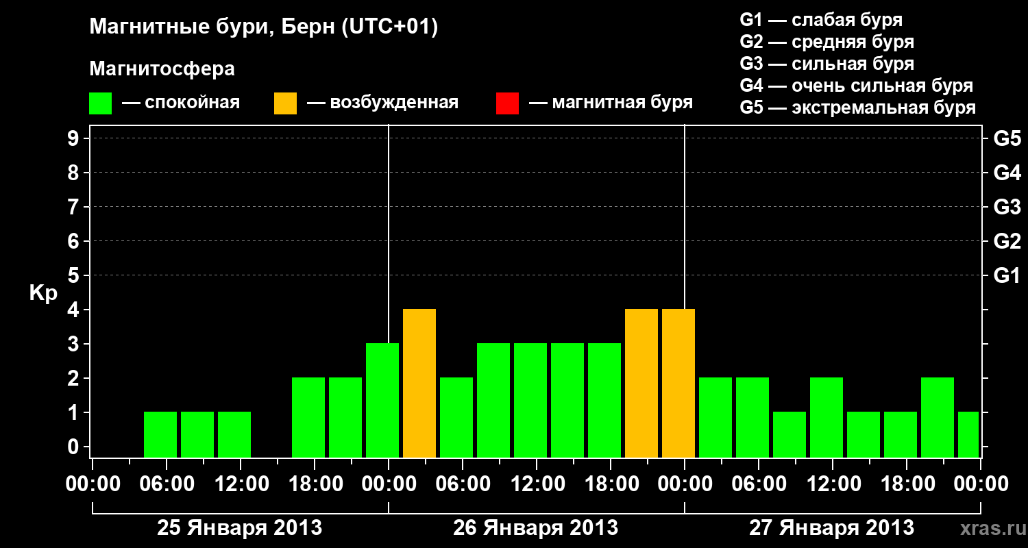 Изменения геомагнитного индекса Kp с 25 по 27 января 2013 года для средних широт