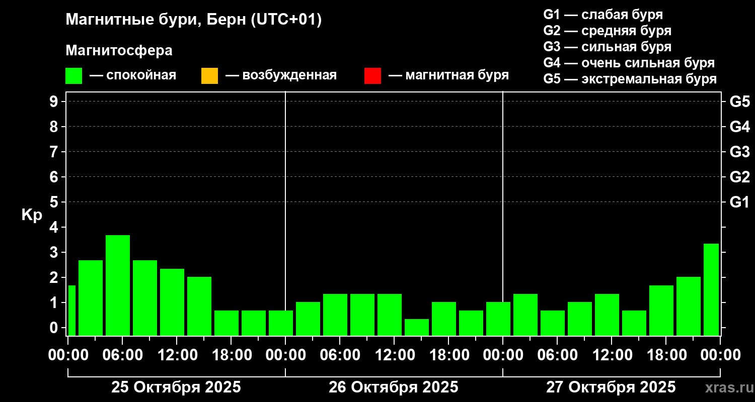 Изменения геомагнитного индекса Kp с 25 по 27 октября 2025 года для средних широт