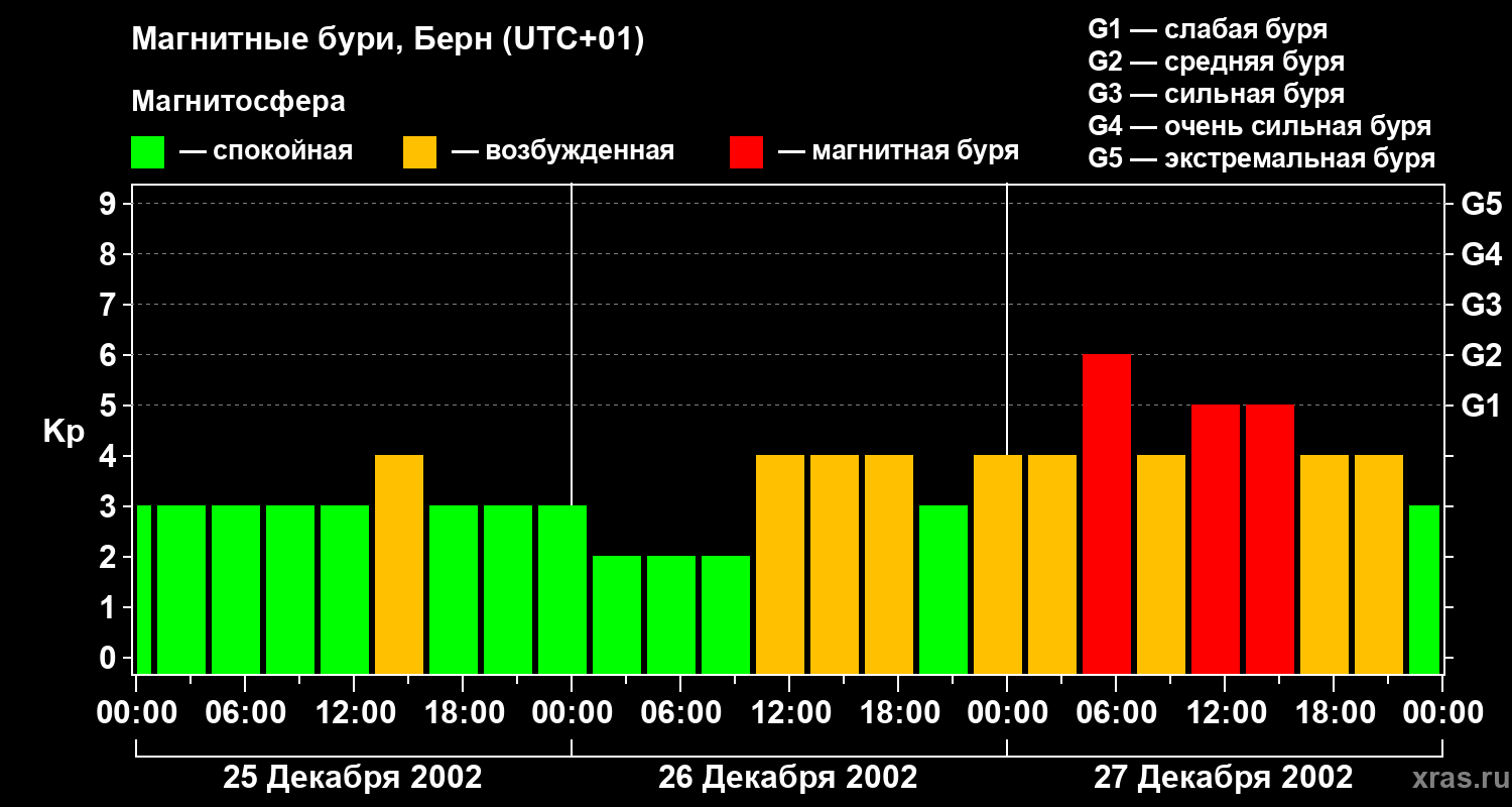 Изменения геомагнитного индекса Kp с 25 по 27 декабря 2002 года для средних широт