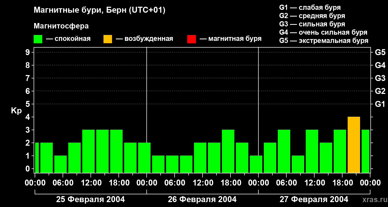 Изменения геомагнитного индекса Kp с 25 по 27 февраля 2004 года для средних широт