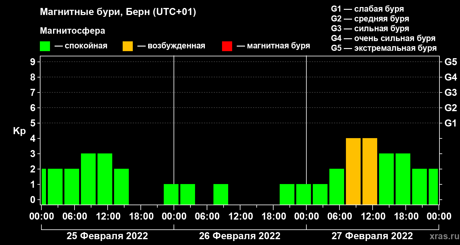 Изменения геомагнитного индекса Kp с 25 по 27 февраля 2022 года для средних широт