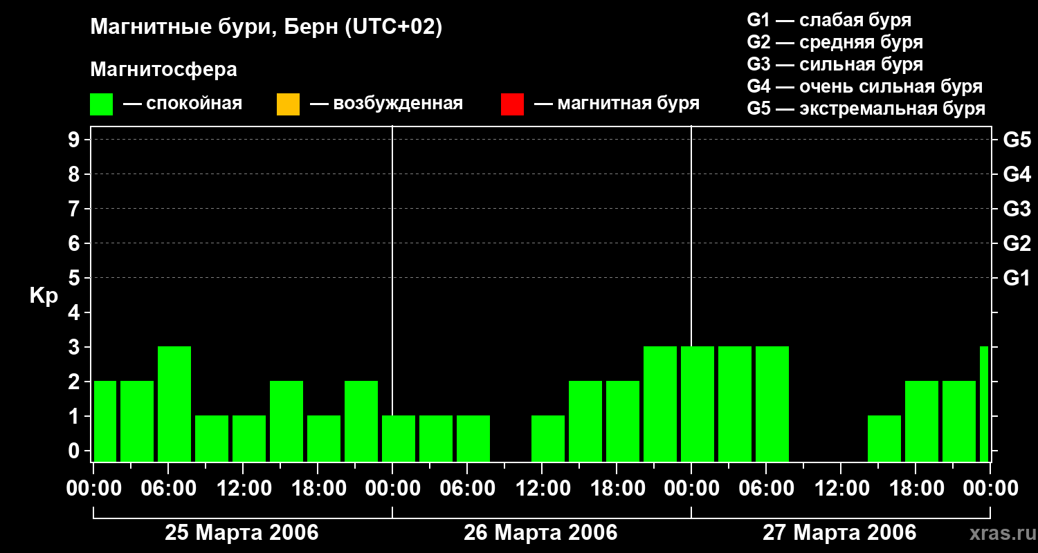 Изменения геомагнитного индекса Kp с 25 по 27 марта 2006 года для средних широт