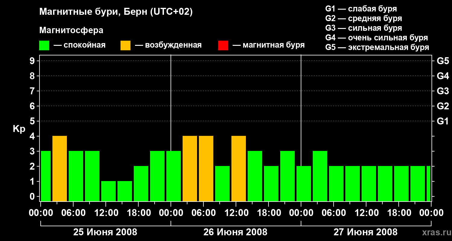 Изменения геомагнитного индекса Kp с 25 по 27 июня 2008 года для средних широт