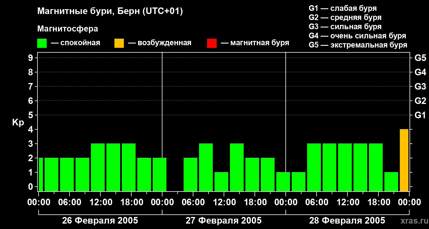 Изменения геомагнитного индекса Kp с 26 по 28 февраля 2005 года для средних широт