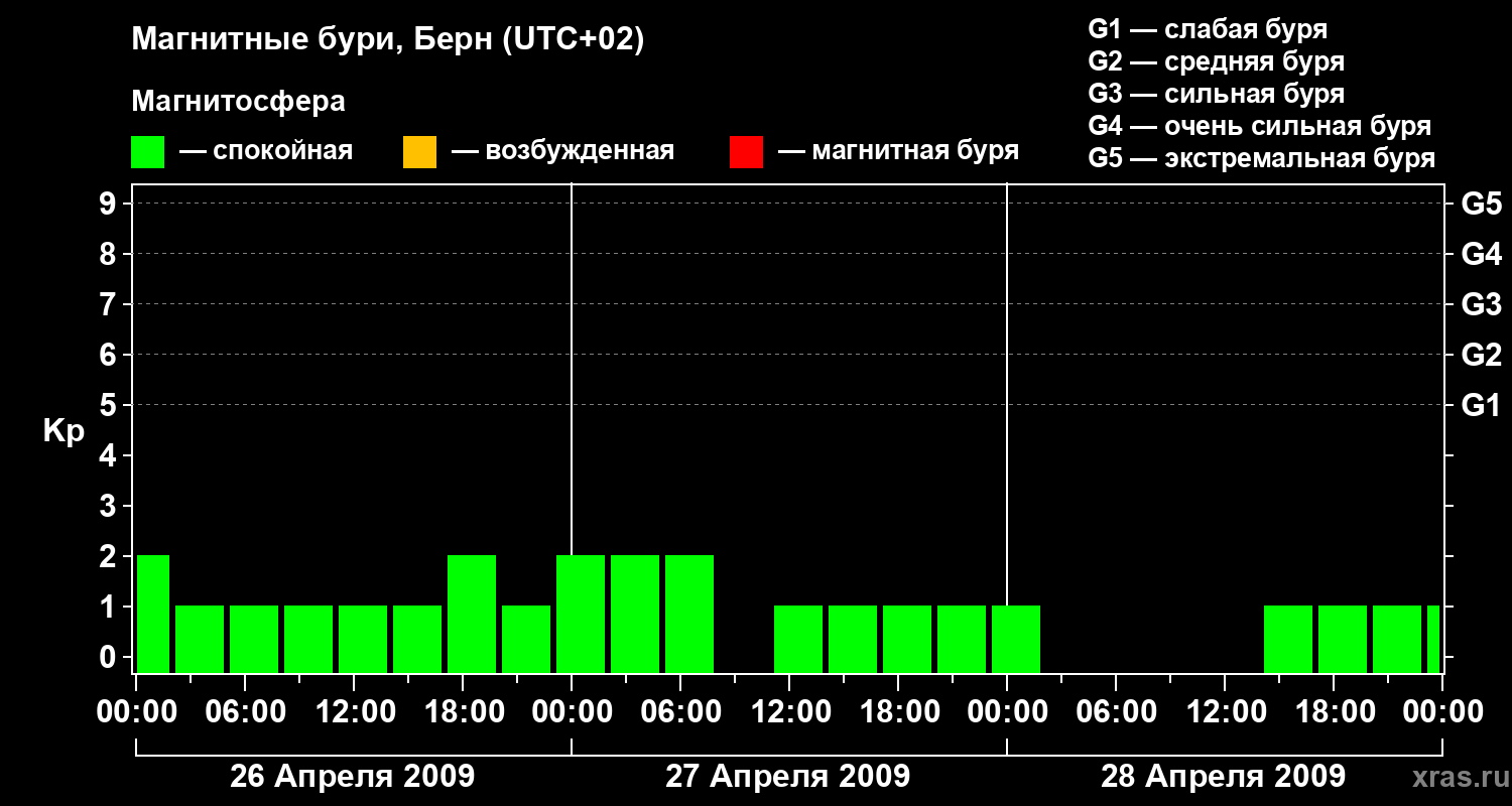 Изменения геомагнитного индекса Kp с 26 по 28 апреля 2009 года для средних широт