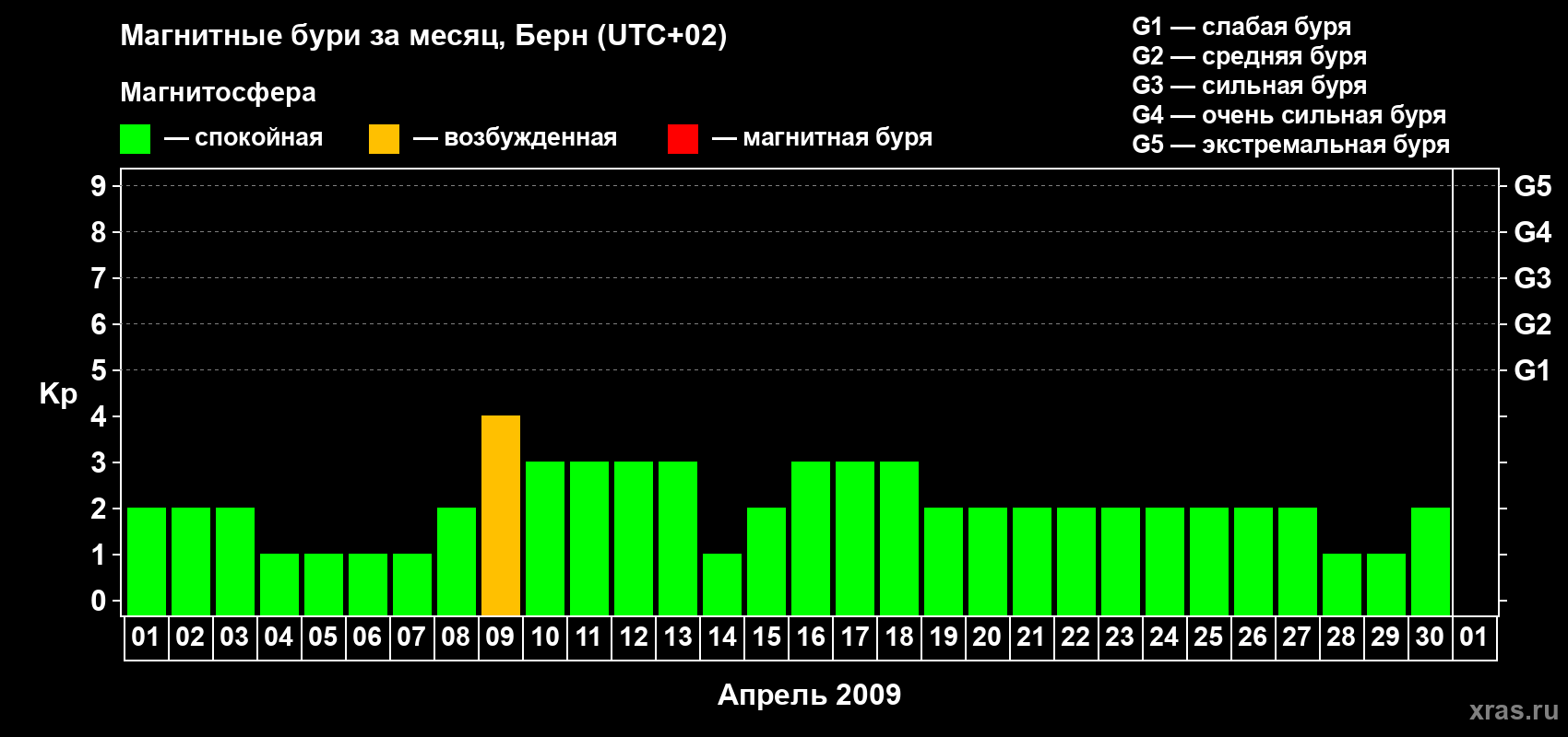Изменения максимального суточного геомагнитного индекса Kp в апреле 2009 года для средних широт