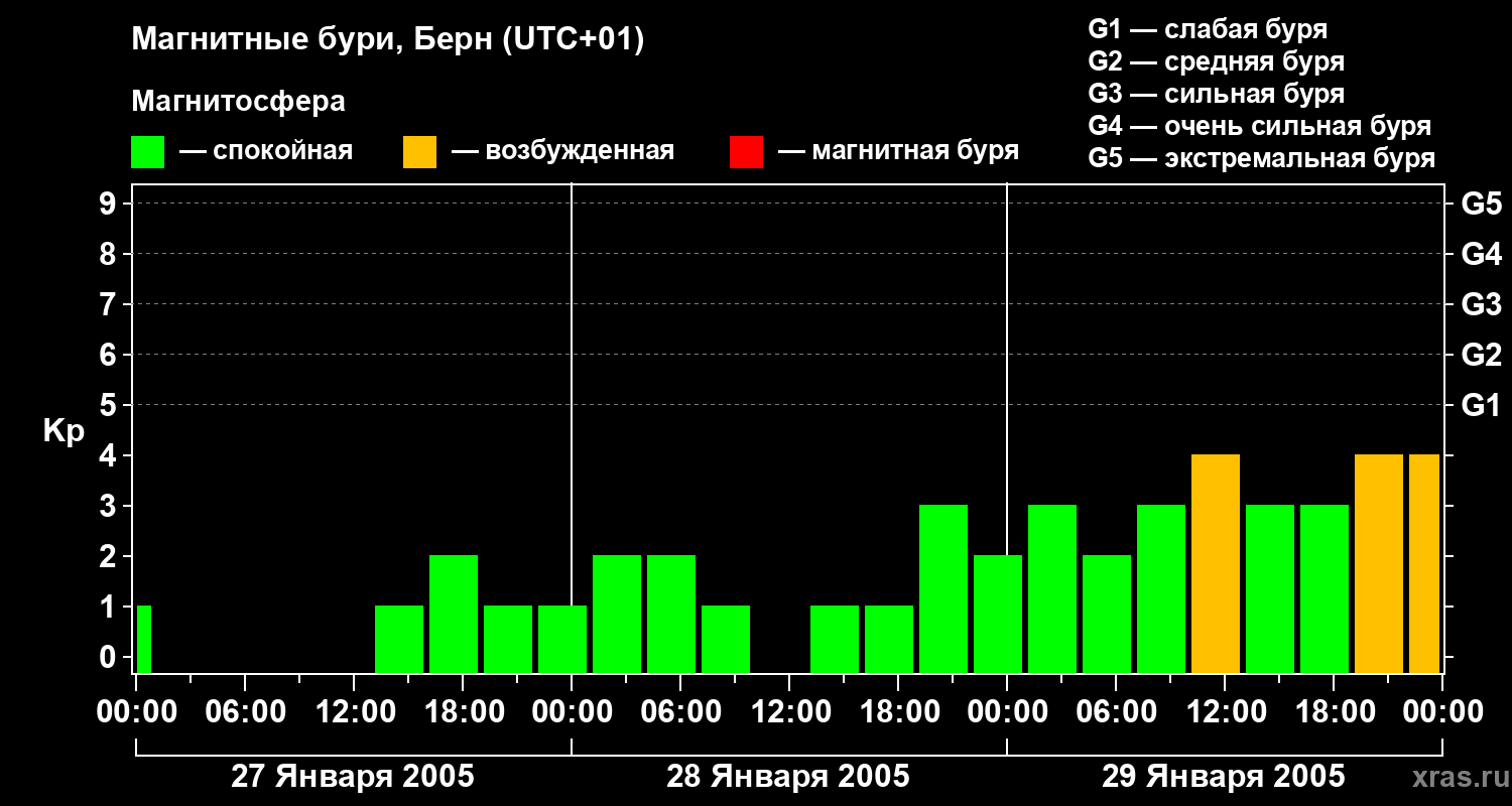 Изменения геомагнитного индекса Kp с 27 по 29 января 2005 года для средних широт