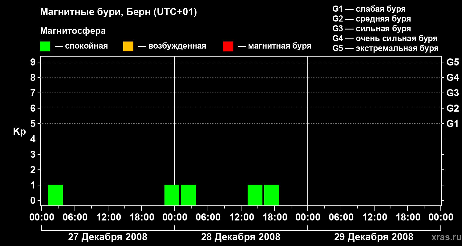 Изменения геомагнитного индекса Kp с 27 по 29 декабря 2008 года для средних широт