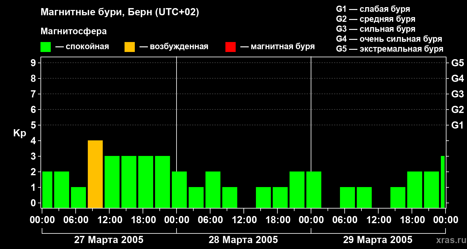 Изменения геомагнитного индекса Kp с 27 по 29 марта 2005 года для средних широт