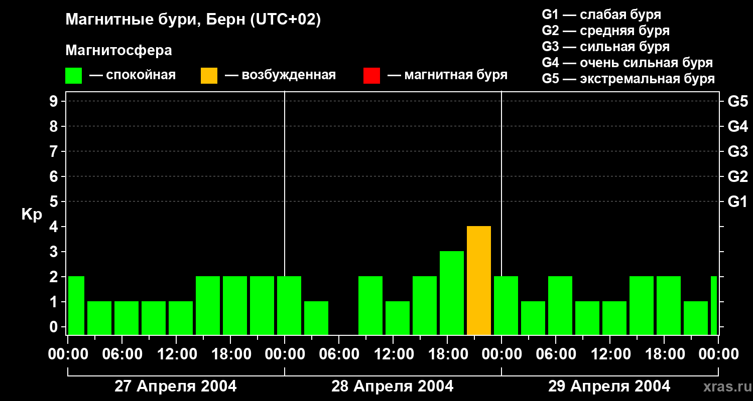 Изменения геомагнитного индекса Kp с 27 по 29 апреля 2004 года для средних широт