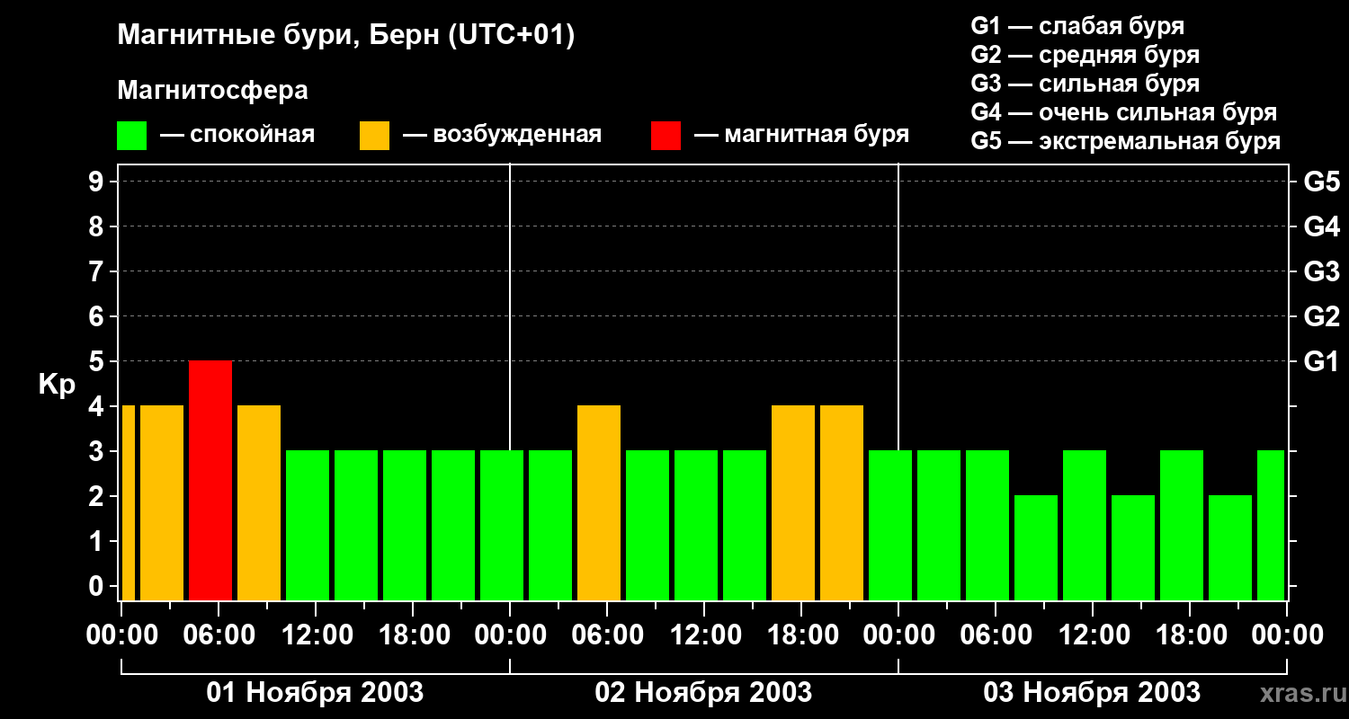 Изменения геомагнитного индекса Kp с 1 по 3 ноября 2003 года для средних широт