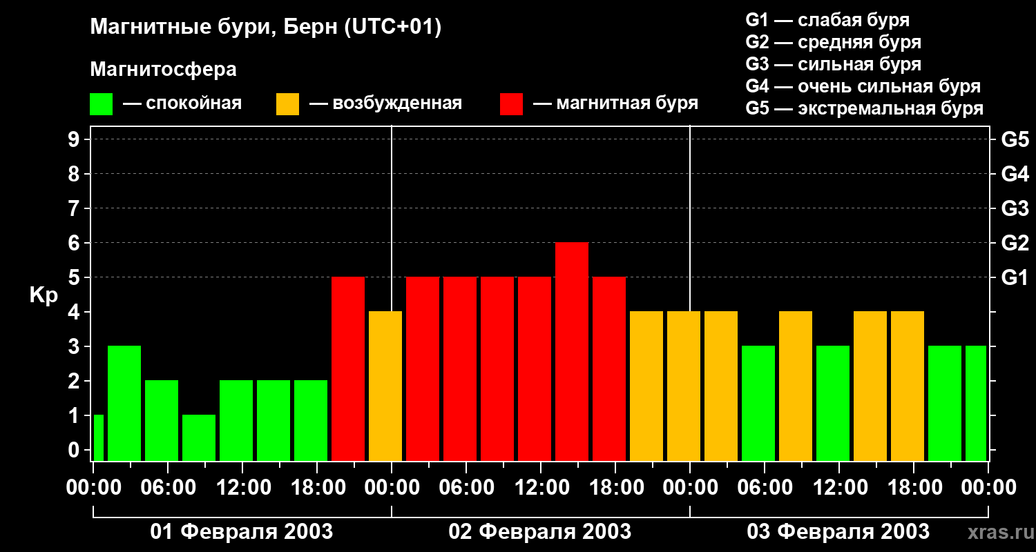 Изменения геомагнитного индекса Kp с 1 по 3 февраля 2003 года для средних широт