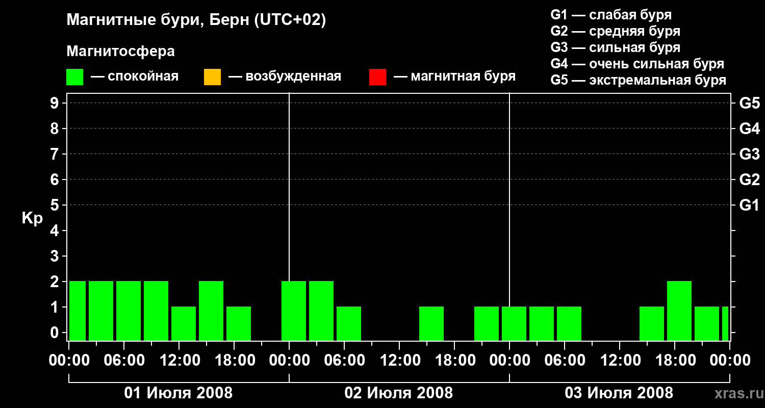 Изменения геомагнитного индекса Kp с 1 по 3 июля 2008 года для средних широт