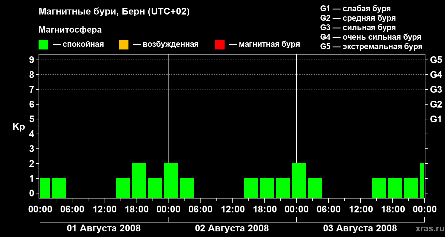 Изменения геомагнитного индекса Kp с 1 по 3 августа 2008 года для средних широт