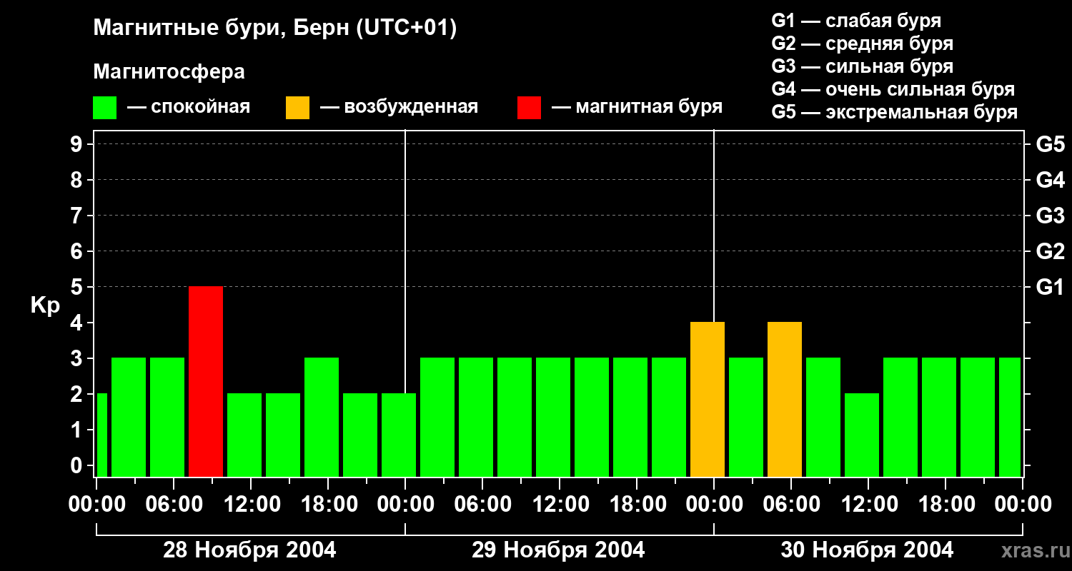 Изменения геомагнитного индекса Kp с 28 по 30 ноября 2004 года для средних широт