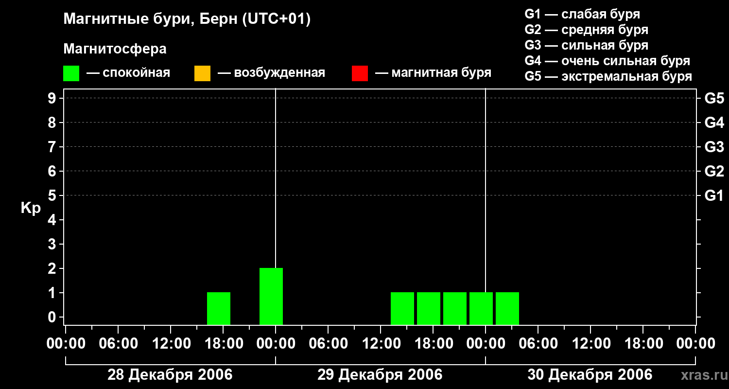 Изменения геомагнитного индекса Kp с 28 по 30 декабря 2006 года для средних широт