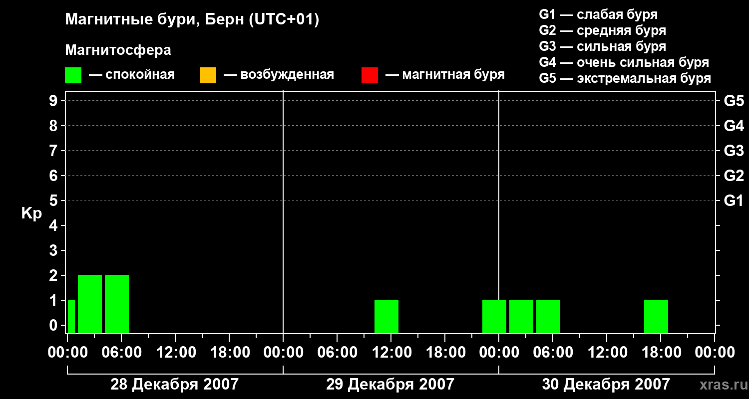 Изменения геомагнитного индекса Kp с 28 по 30 декабря 2007 года для средних широт