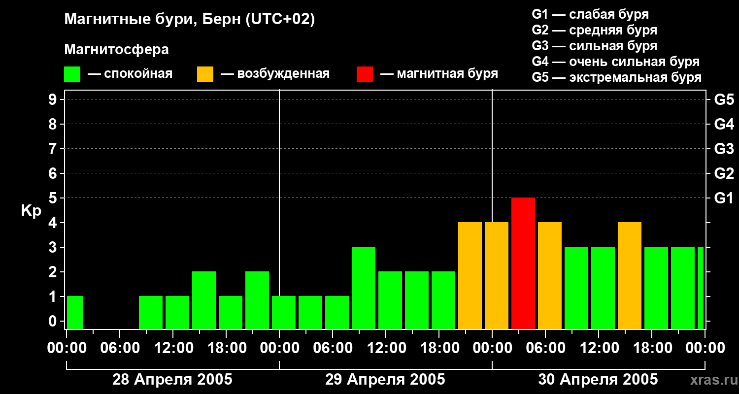 Изменения геомагнитного индекса Kp с 28 по 30 апреля 2005 года для средних широт