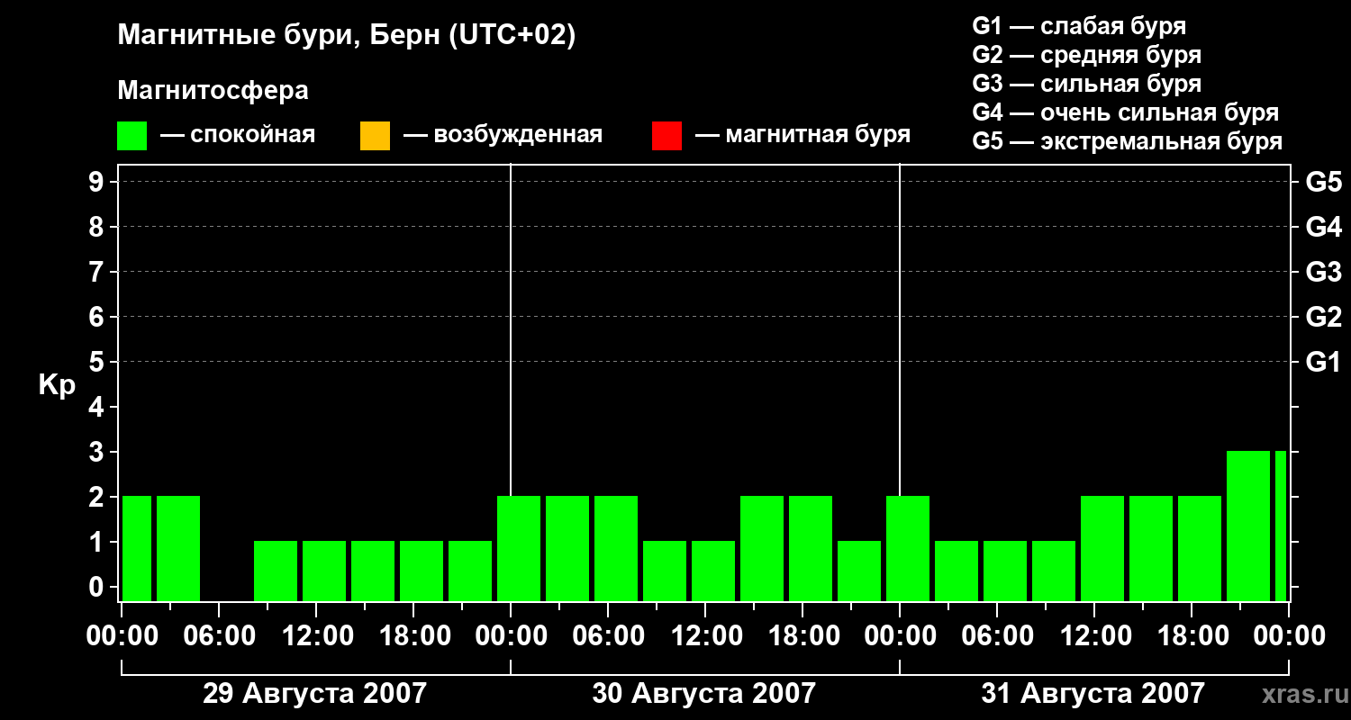 Изменения геомагнитного индекса Kp с 29 по 31 августа 2007 года для средних широт