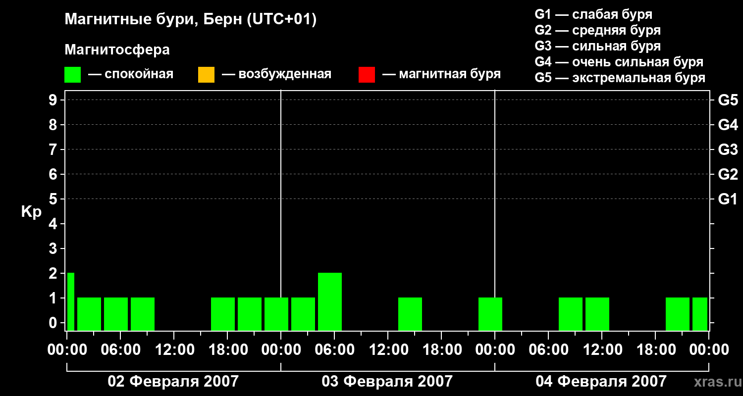 Изменения геомагнитного индекса Kp с 2 по 4 февраля 2007 года для средних широт