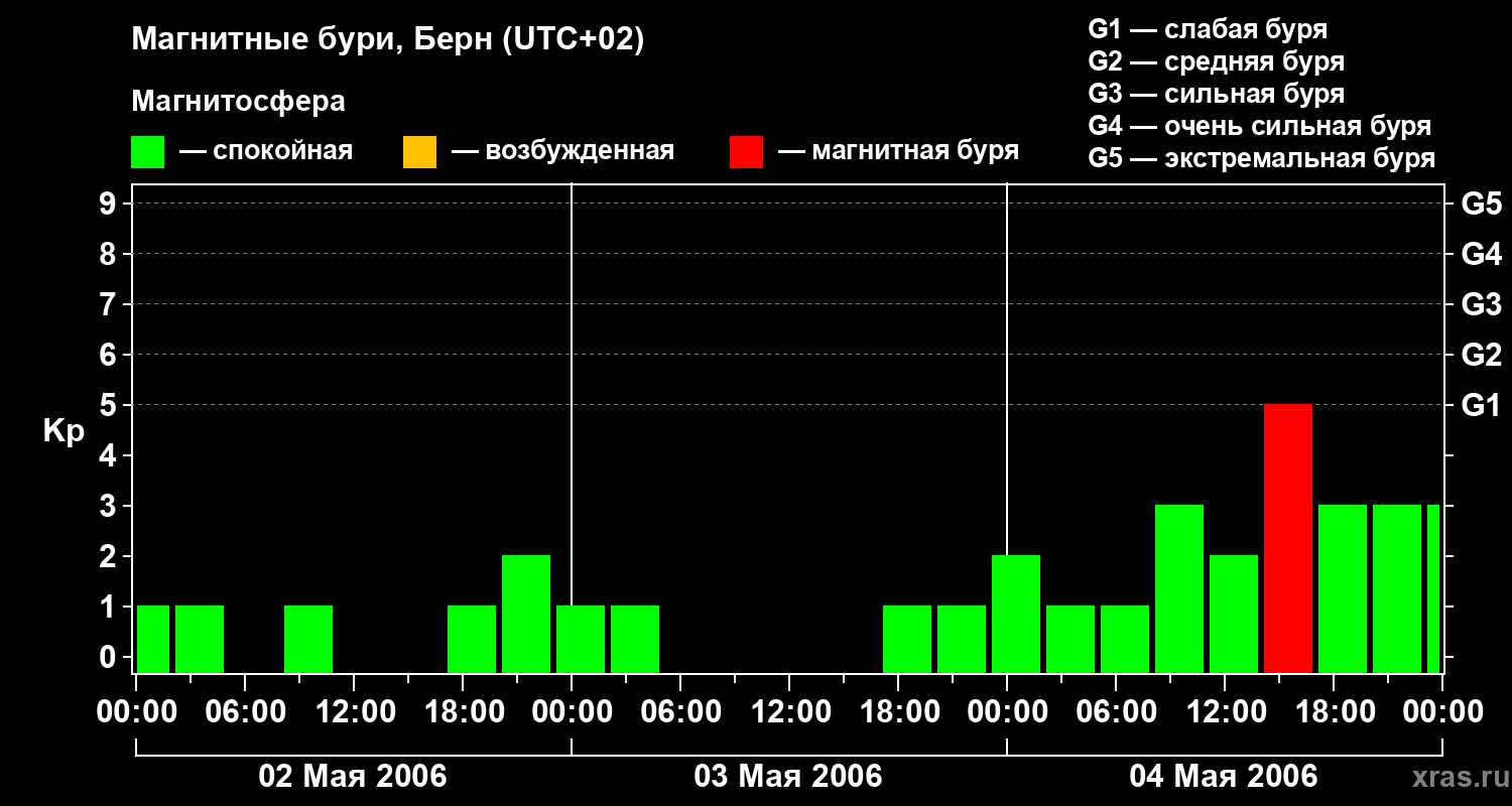 Изменения геомагнитного индекса Kp с 2 по 4 мая 2006 года для средних широт