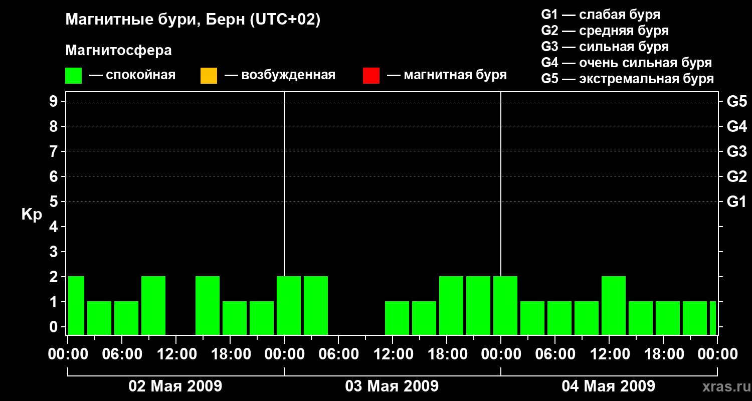Изменения геомагнитного индекса Kp с 2 по 4 мая 2009 года для средних широт