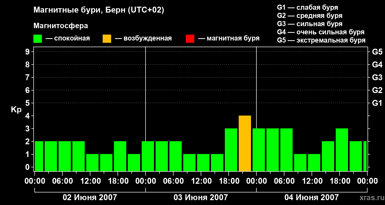 Изменения геомагнитного индекса Kp с 2 по 4 июня 2007 года для средних широт