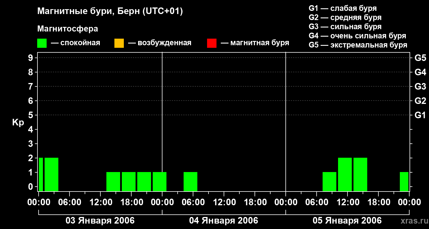 Изменения геомагнитного индекса Kp с 3 по 5 января 2006 года для средних широт