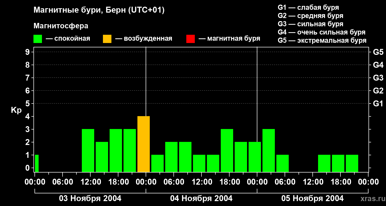 Изменения геомагнитного индекса Kp с 3 по 5 ноября 2004 года для средних широт