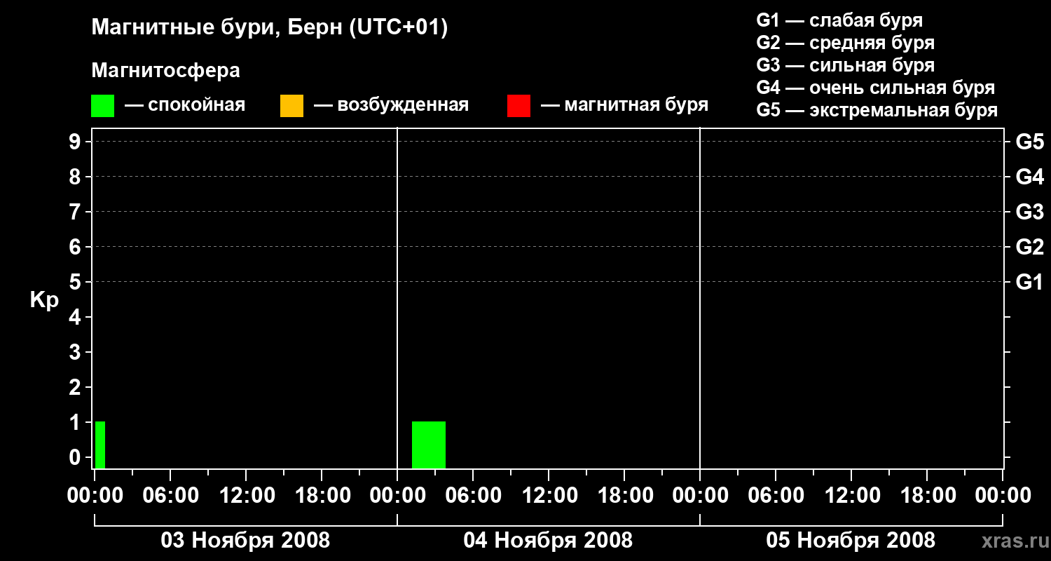 Изменения геомагнитного индекса Kp с 3 по 5 ноября 2008 года для средних широт