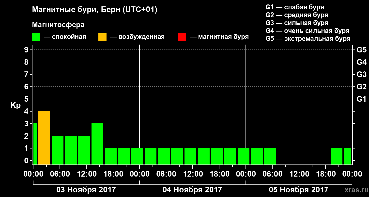 Изменения геомагнитного индекса Kp с 3 по 5 ноября 2017 года для средних широт